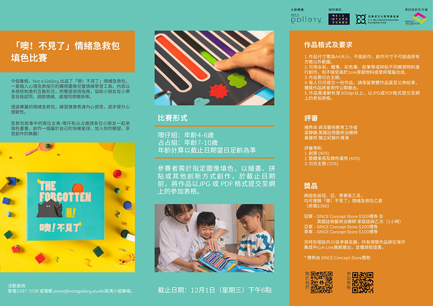 今個暑假,Not a Gallery 出品了「噢!不見了」情緒急救包,一套融入心理急救指引的觸感圖像兒童情緒學習工具,內容以多感統刺激的互動形式,附雙語使用指南,協助小朋友從小學習自我認同、調節情緒和處理同儕關係等,透過專屬的情緒急救包,學習健康表達內心感受,逐步提升心理韌性。