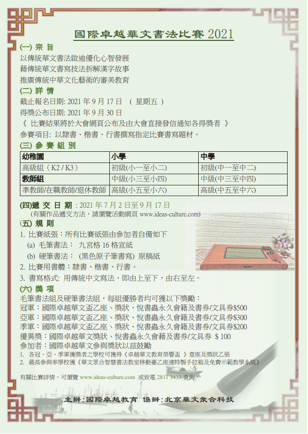 2.最高參與率學校獲《華文眾合智慧書法教室移動臺乙座連特製手拉箱及免費示範教學系統》