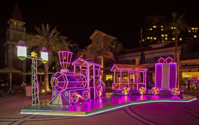 聖誕火車由拼貼藝術及光影裝置所創作,寓意愉景灣 40 年來璀璨精彩的變化及發展。配合南歐小島風情,大家彷彿真的坐火車到歐洲歡度聖誕佳節。