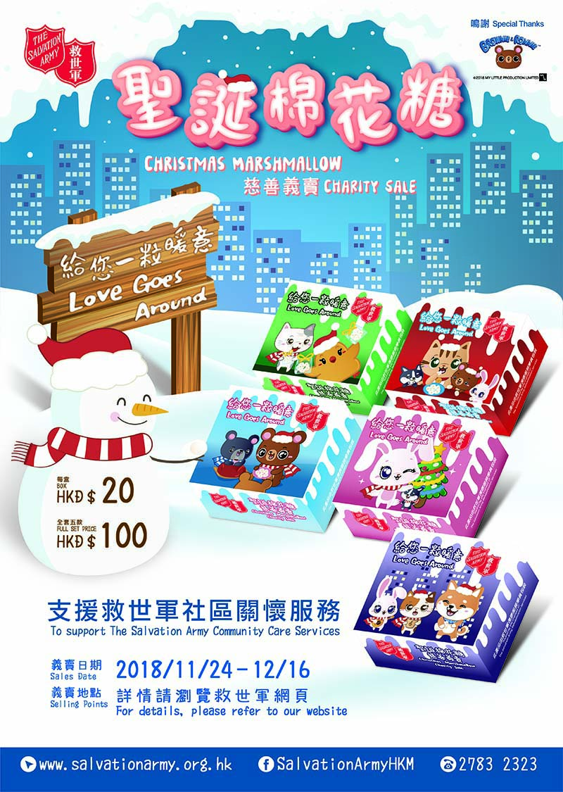 聖誕節,是一個充滿愛和喜樂的節日。今年救世軍與My Little Production的本地插畫家合作,設計五款窩心精緻包裝的棉花糖,於聖誔「給您一粒暖意」,讓大家與親友分享佳節喜悅的時候,為弱勢社群帶來溫暖。