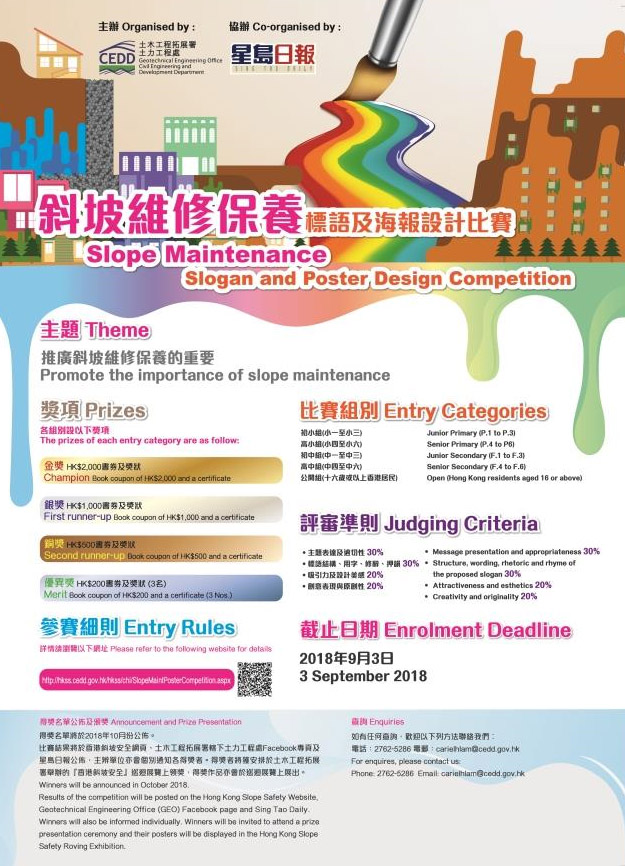 詳情可留意官方網站。http://hkss.cedd.gov.hk/hkss/chi/SlopeMaintPosterCompetition.aspx