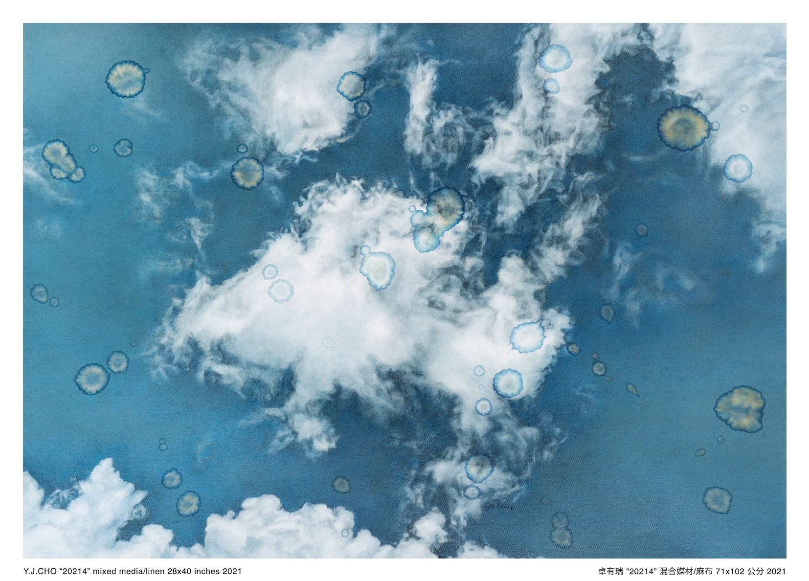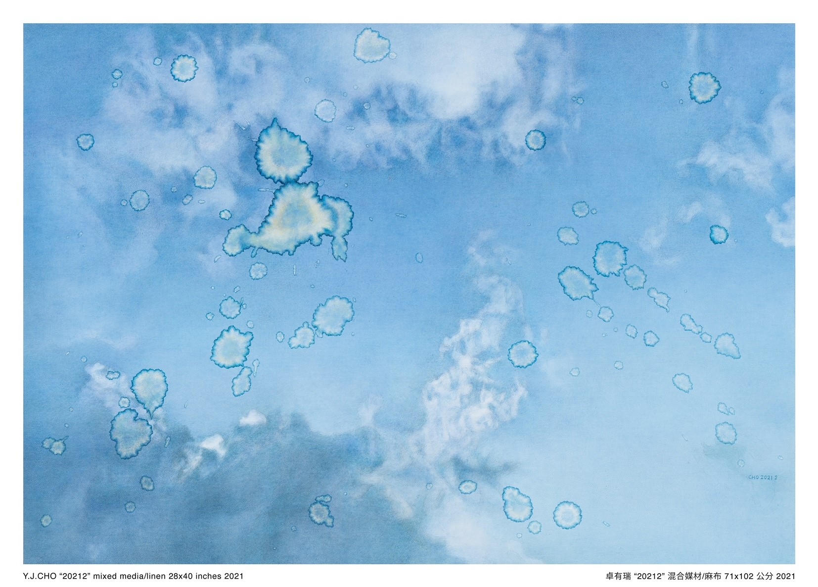 是次展出2020年創作的「霧影系列」及2021年創作的「蒼穹系列」,共14幅全新作品。卓氏特意加入水漬的形象,以豐富視覺體驗並增加作品的可能性。卓氏著名的湮染水漬,原是無心插柳所得的意外效果,畫家把它移植到畫面上,令作品顯得更耐人尋味。水漬可以是飄浮的光印,為景色添上一抹詩情;或是透光玻璃上的水痕,使觀者有着全新的視覺感受。