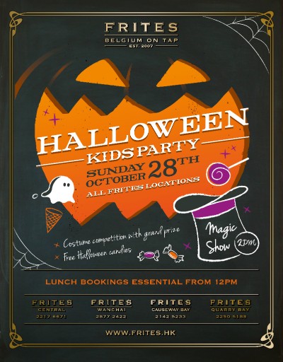 萬聖節魔術表演派對於 10月 28日 (星期日)下午 2 時在各分店舉行,午餐時間由中午12 時開始。FRITES現於中環、灣仔、銅鑼灣及鰂魚涌設有分店。為免向隅,敬請提早預訂座位,FRITES 期待與一眾大小嘩鬼歡度萬聖節。