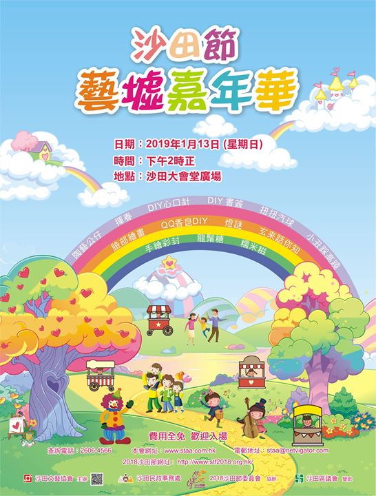 由沙田文藝協會主辦,2018沙田節委員會及沙田民政事務處協辦的“沙田節-藝墟嘉年華”,將於2019年1月13日(星期日)假沙田大會堂廣場(百步梯)舉行。藝墟文藝攤位包括:陶藝公仔、揮春、手繪彩封、扭扭汽球、QQ香皀DIY、臉部彩繪、免費小食等,以傳揚傳統手藝文化,並為沙田區居民帶來歡樂氣氛。