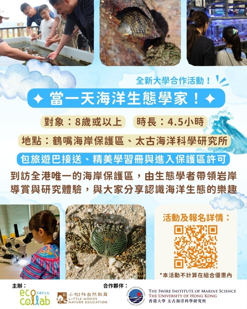 你曾經有過做海洋科學家的夢想,卻又覺得遙不可及💭?現在機會來了🥳!小樹林很榮幸能與夥伴機構EcoCollab 同續共生社以及香港大學太古海洋科學研究 (SWIMS) 所展開合作,為公眾帶來一個當海洋生態學家的體驗🧑🏻🔬!