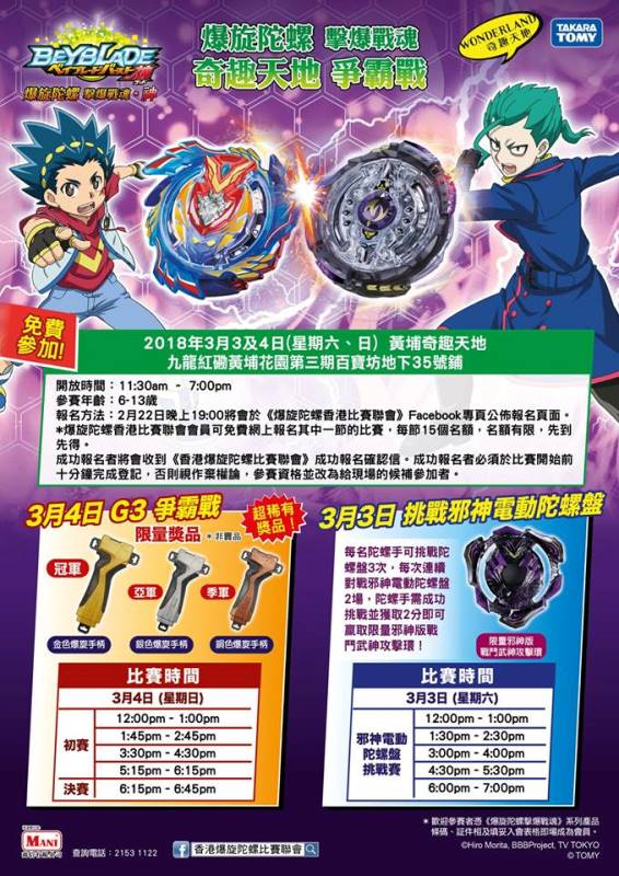 《爆旋陀螺擊爆戰魂 奇趣天地爭霸戰》將會於3月3及4日於黃埔奇趣天地舉行!香港爆旋陀螺比賽聯會會員可於2月22日晚上7:00網上報名每天其中一場比賽,歡迎各陀螺手踴躍參與!