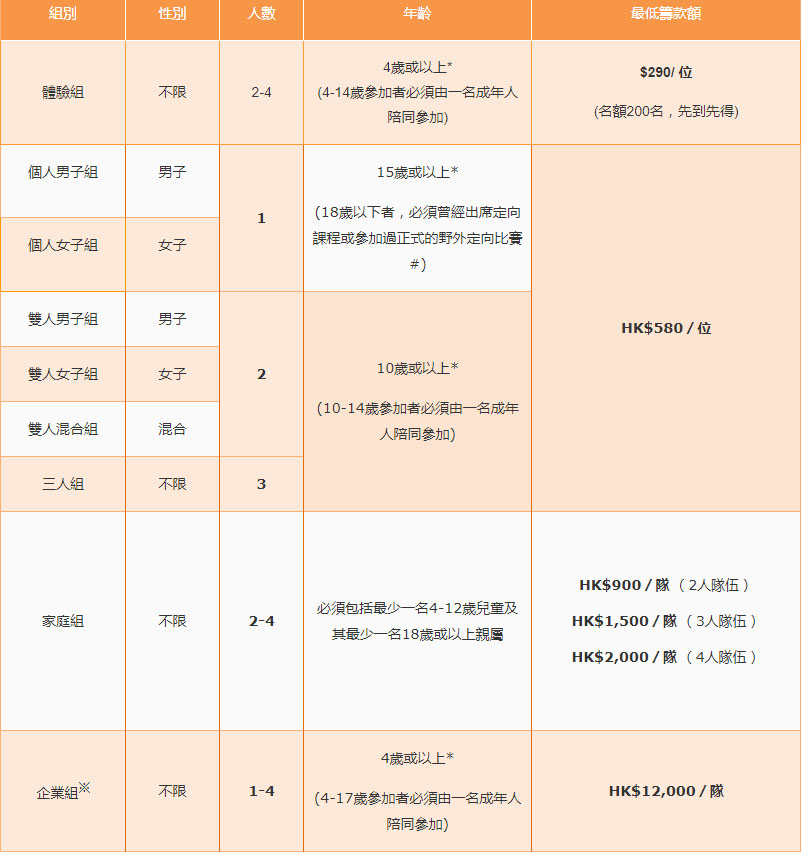 | 比賽組別: | 體驗組、個人組(男子/女子)、二人組(男子/女子/混合)、三人組、家庭組、企業組 |