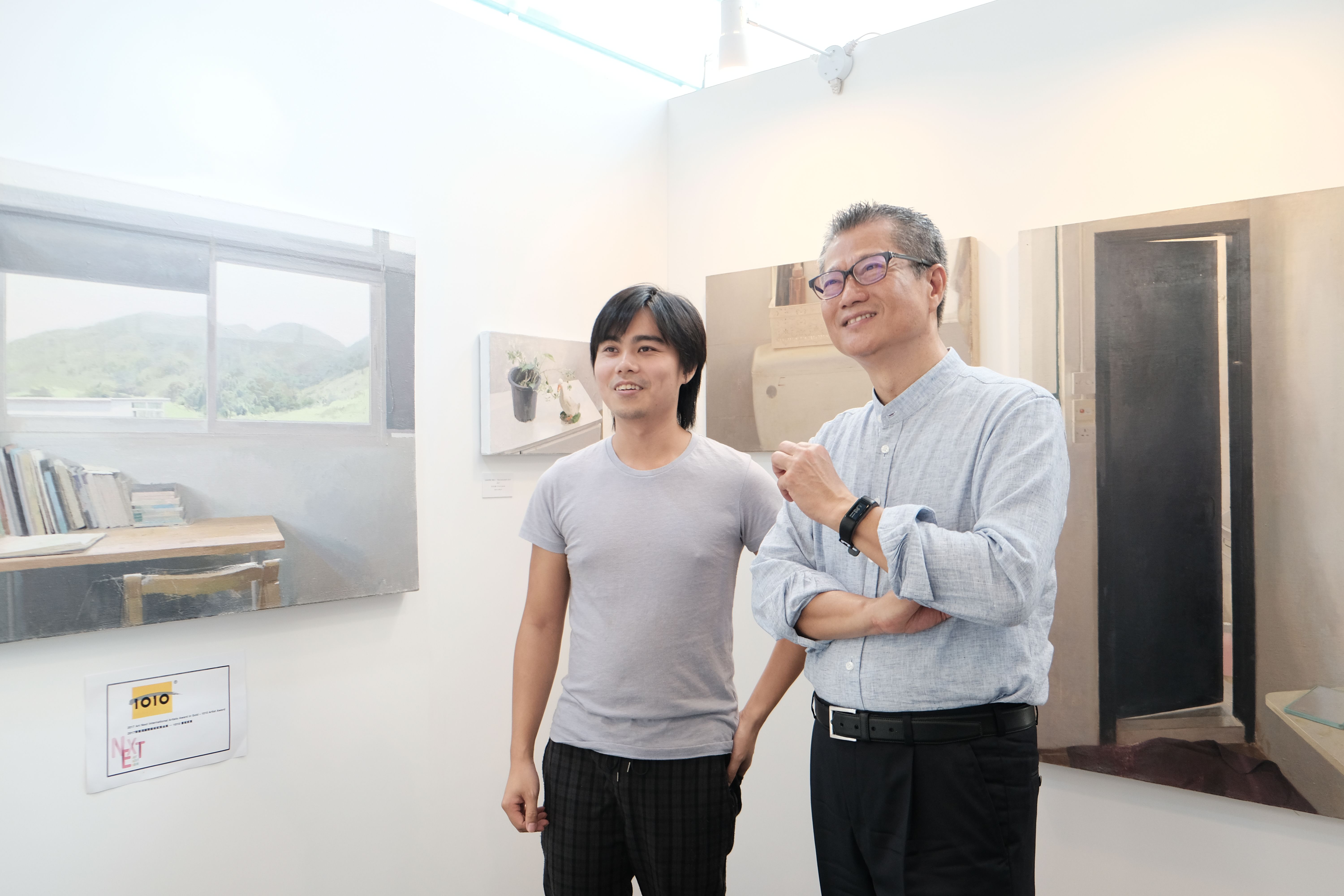 財政司司長陳茂波到場與上一屆新藝潮國際藝術家奬金獎得獎者胡浚諺談論他的藝術創作概念。
