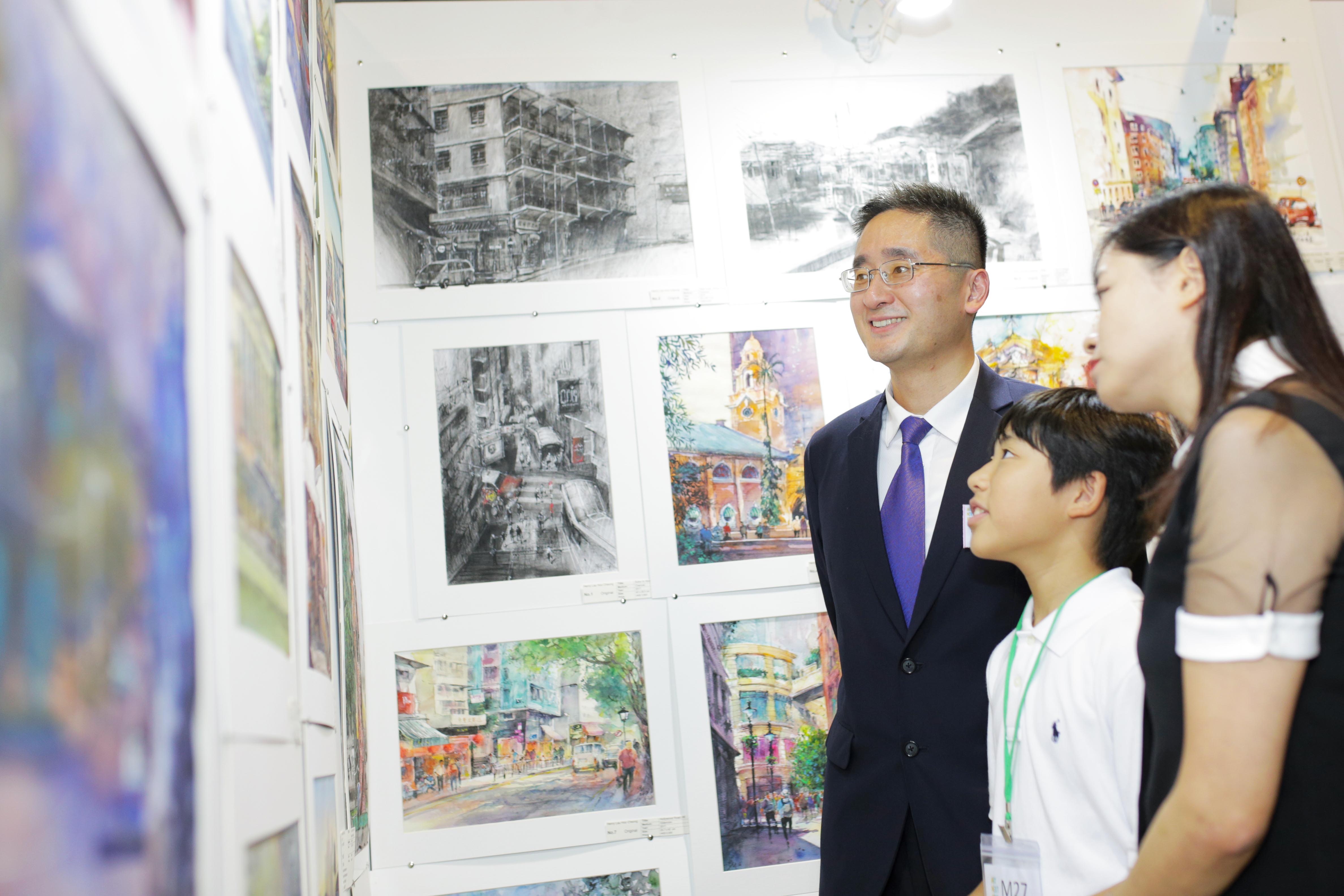 商務及經濟發展局副局長陳百里博士出席上屆新藝潮博覽會時與超年青藝術家劉見之會面並欣賞其作品。