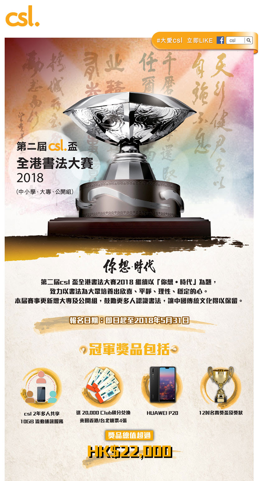 第二屆csl 盃全港書法大賽2018 繼續以「你想‧時代」為題,致力以書法為大眾培養出欣喜、平靜、理性、穩定的心。本屆賽事更新增大專及公開組,鼓勵更多人認識書法,讓中國傳統文化得以保留。