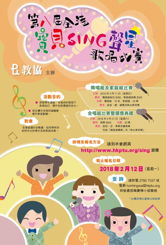 | ﹝請各參加者於2018年2月26日(一)起,登入http://www.hkptu.org/sing 瀏覽及下載比賽各項詳情。大會將不另行發電郵或信函通知各參加者,敬請留意。﹞ | |