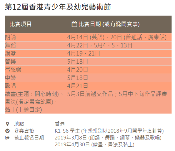 截止報名日期 :2019年3月8日 (朗誦、舞蹈、鋼琴、樂器及歌唱)
