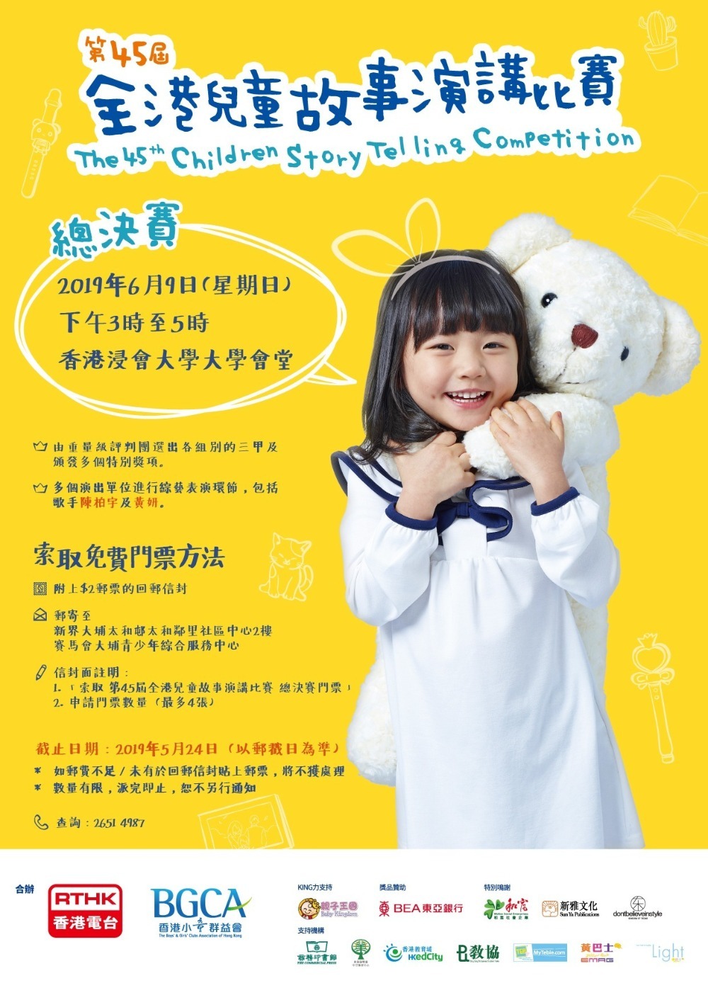 第45屆全港兒童故事演講比賽已進入總決賽, 歡迎公眾人士索取免費門票, 入埸觀看精彩比賽。