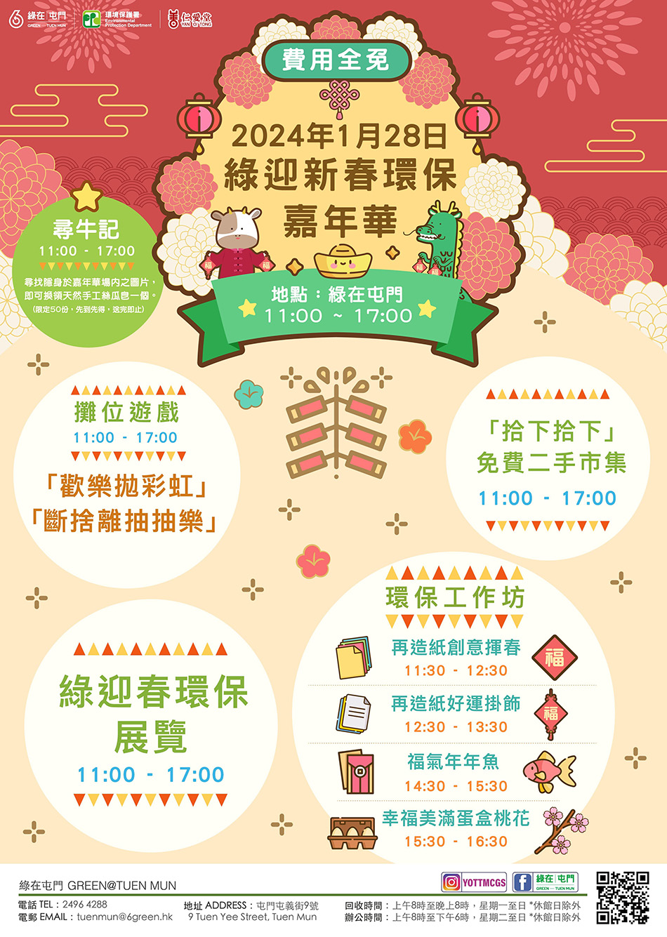 🎈活動:綠迎春環保展覽、環保工作坊、免費二手物市集、攤位遊戲及「尋牛記」特別活動