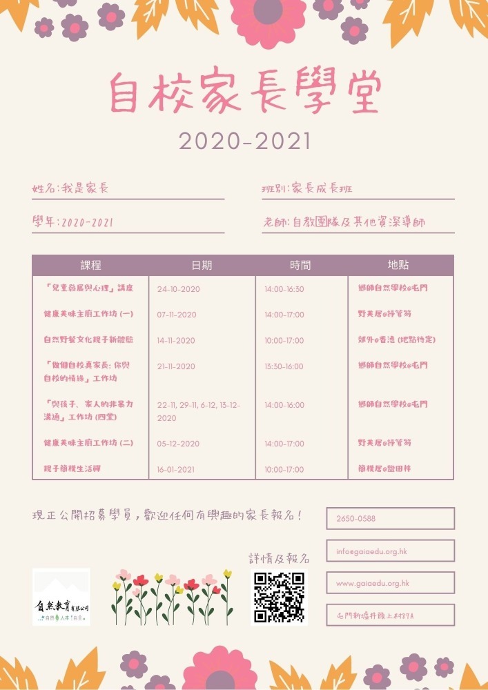 教養孩子,除了家庭與學校需要理念相近、共同合作,良好的家庭關係亦不可或缺。有見及此,「自校家長學堂」將舉辦一系列活動課程,幫助家長了解自校「自然、人本、自主」的理念,同時提升親子溝通質素,促進家庭和諧,建立身心健康的家庭關係。
