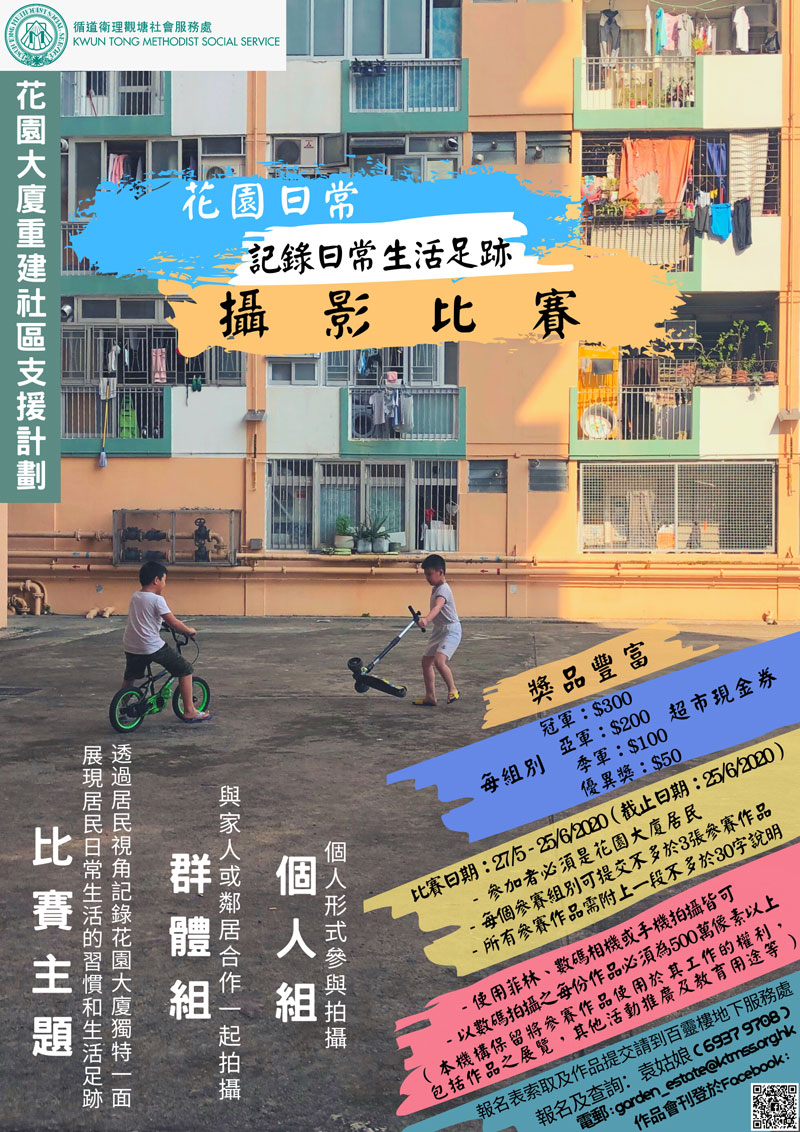 - 照片須為參賽者本人的原創作品,並無侵犯他人的權益(包括版權)。得獎作品的版權屬循道衛理觀塘社會服務處所有。