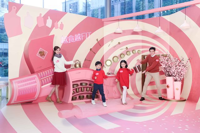所謂「民以食為天,食以廚為先」,廚房是家人「大展身手」、烹調美食的地方,所以其佈局絕不能忽視。走進錯覺的廚房空間,廚櫃的形狀變得彎彎曲曲,林林總總的廚具瞬間「飛起來」貼滿牆的周圍。地上的擀麵棍也被放大數十倍,只要配合最佳的攝影位置,便可以錯視的方式拍下小朋友坐上「巨型擀麵棍」的特別效果,將夢境或不真實的場景帶來現實生活中,以假亂真。而且響應新年的傳統,更掛上祝福語句「越食越FIT」,希望大家與家人享用美食的同時,亦可以愈食愈健康,愈窈窕﹗