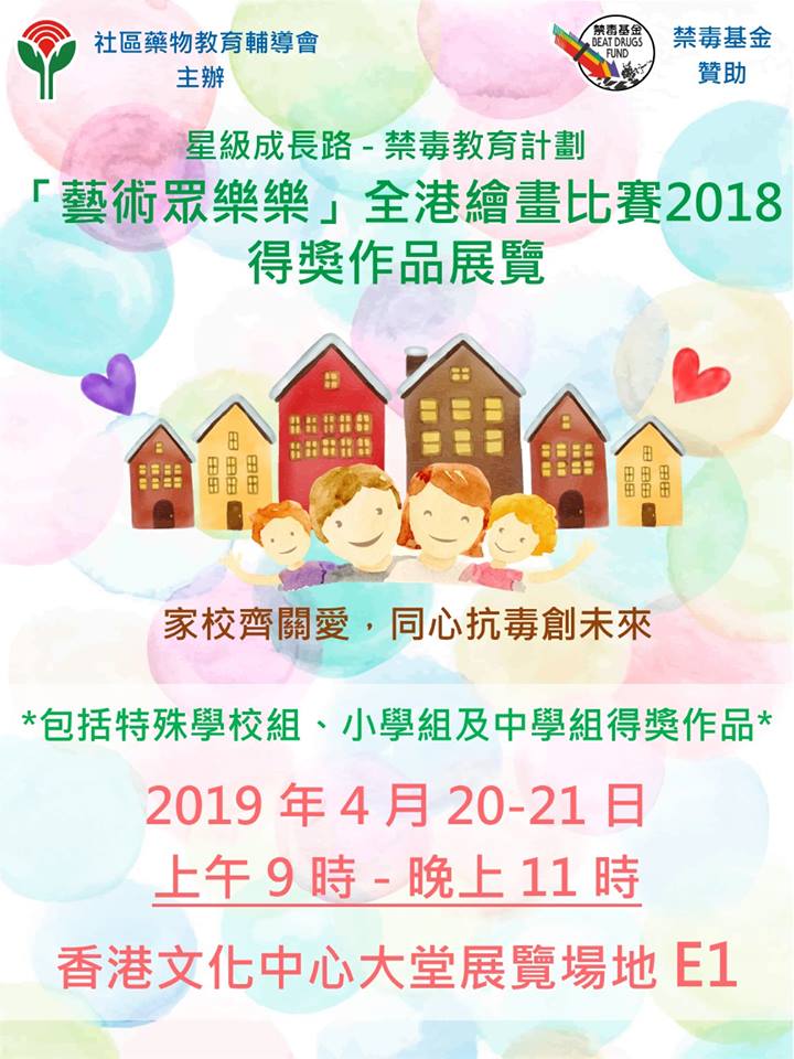 本會獲禁毒基金贊助,舉辦「藝術眾樂樂」全港繪畫比賽2018,培養學生(包括特殊教育需要學童)發揮藝術才華,培養抗毒意識。比賽頒獎禮已完滿結束,得獎作品展覽即將舉行,誠邀大家出席,一同欣賞同學努力的成果及支持抗毒活動。詳情如下: