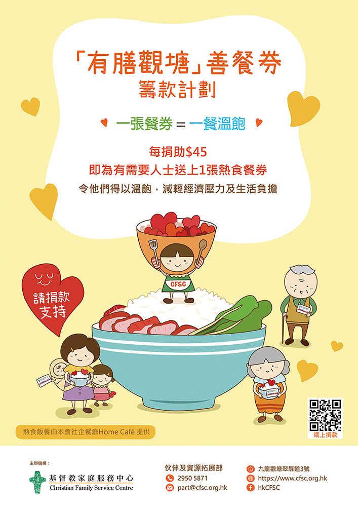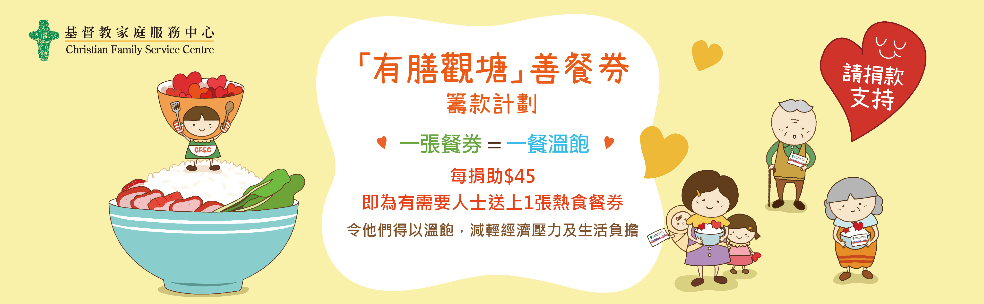 基督教家庭服務中心現正推出「有膳觀塘」善餐券計劃,透過送贈飯券,讓有需要人士在本會營辦的社會企業免費換取一份$45的熱食飯餐,讓他們得以溫飽,減輕經濟負擔,並暫且放下生活重擔,在用餐時感受暖暖的社區關愛。現誠邀 閣下支持,將捐款化作愛和祝福。