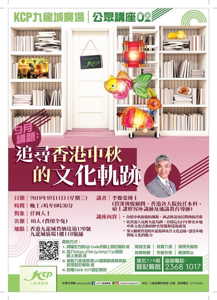 是次九月份的講座主題將與中秋節有關。中秋節於華人社會,有著重要的團圓意 義。同時,在源遠流長的歷史裡,不同地方都流傳著許多有關中秋的神話傳說、風 俗習慣;就以香港為例,其中以最具香港本土特色大坑舞火龍作為活動慶典,這項 有百年歷史的傳統習俗不單是被列入非物質文化遺產;更是一個凝聚本地社區精神 及吸引世界各地遊客參觀的盛事。 關於香港的中秋節風俗,你知道多少呢?如果你對香港的歷史文化、傳統節俗感興 趣,歡迎你參與由 KCP 九龍城廣場舉辦的「追尋香港中秋的文化軌跡」免費講 座,由專業講者李燦榮先生同大家分享舞火龍的歷史變遷和巡遊盛況,並共同探討 及感受本港傳統節慶文化的魅力!