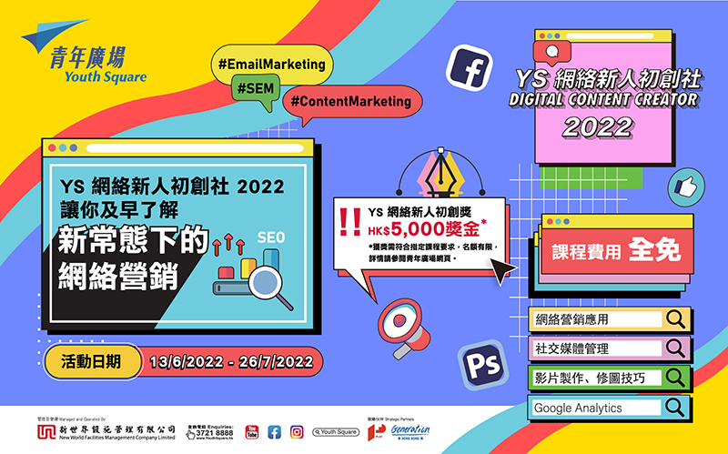 「YS 網絡新人初創社2022」由即日起開始接受網上報名,課程費用全免。整個課程共有十六堂課,內容除包括社交媒體管理、內容營銷、影片製作、修圖技巧、搜尋引擎行銷、社交媒體表現統計、電子郵件行銷及Google Analytics等熱門課程外,更邀得業內人士進行分享。完成課程後,達到指定出席率的學員除可獲得由青年廣場簽發的證書外,表現最優異的五位學員更有機會獲得 HK$5,000獎金以及與我們的策略夥伴合作,真正投身社交媒體管理行業。