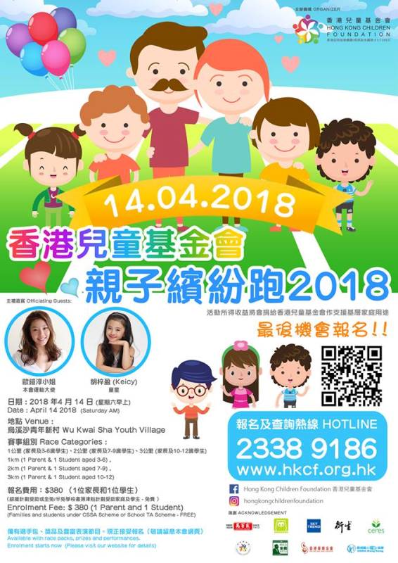 千呼萬喚始出來!由本會主辦的「香港兒童基金會親子繽紛跑 2018」將於 4 月 14 日 (週六早上) 在烏溪沙青年新村舉行。比賽為家長和 3-12 歲小童而設,分別有一、二、三公里選項,在場亦備有豐富獎品、表演及攤位遊戲。