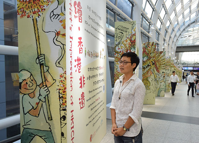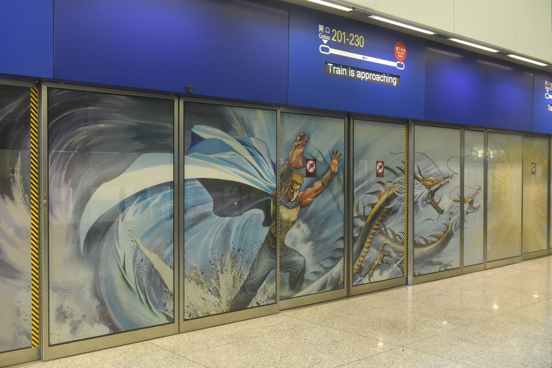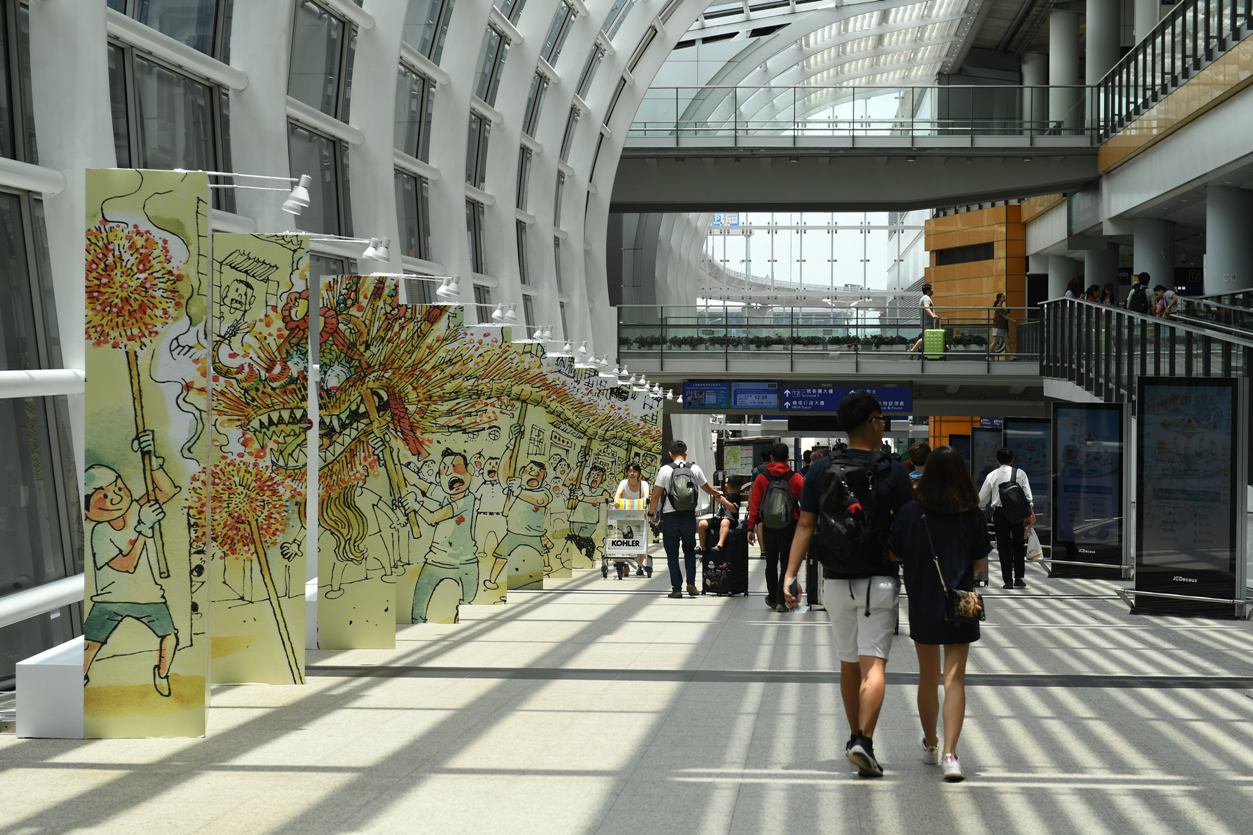 - 「漫遊機場-功夫三部曲」-接機大堂的升降機幕牆及旅客捷運系統的月台幕門大變身,印上由三位香港知名藝術家曹志豪、李志清及李健良繪製的漫畫,帶大家漫遊功夫與拳擊世界。