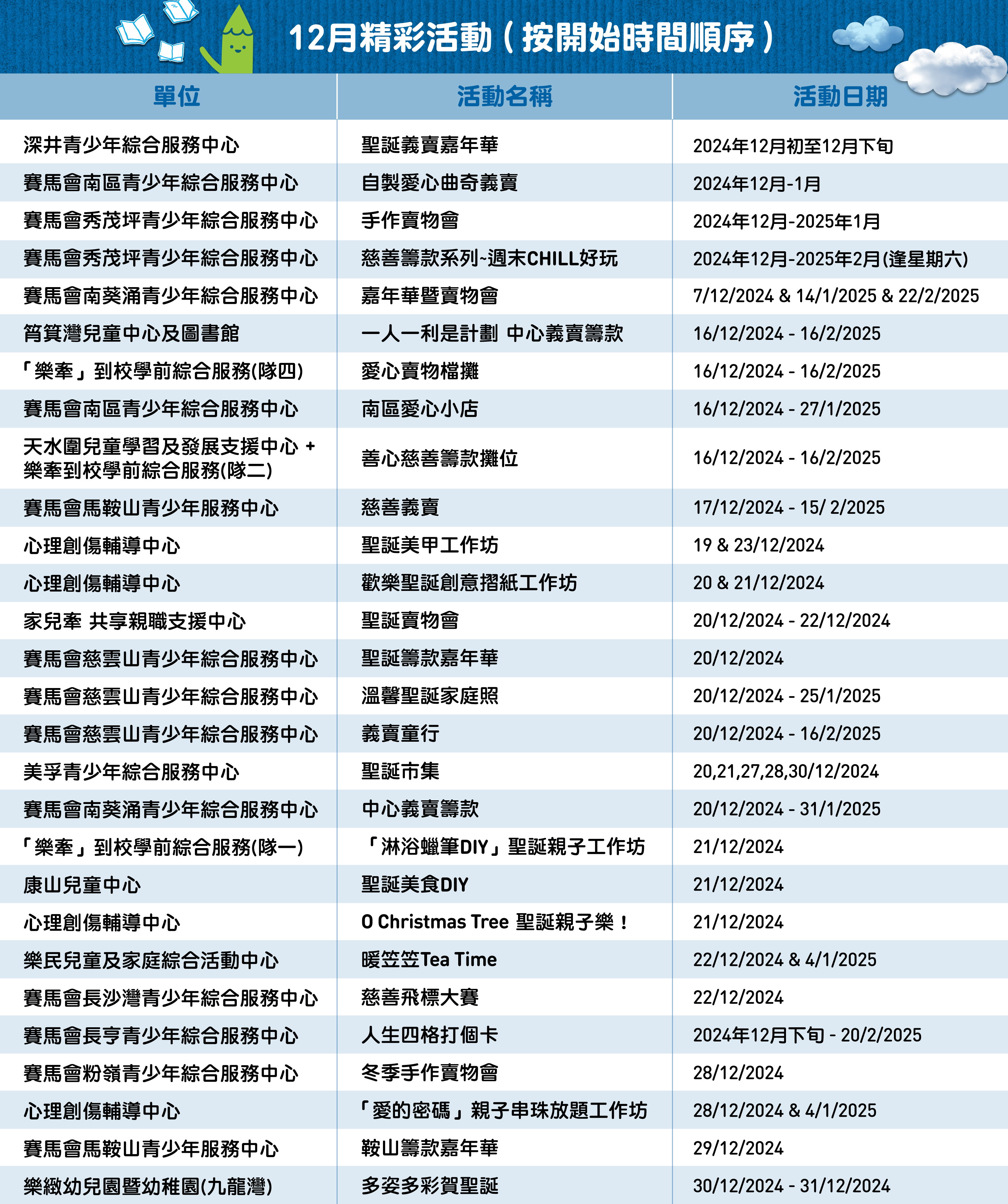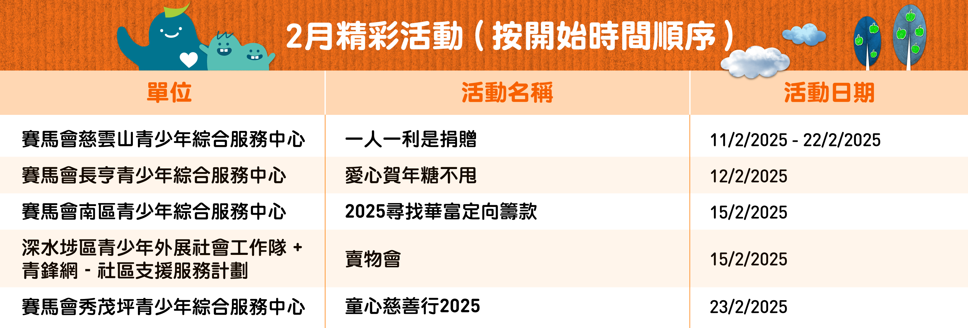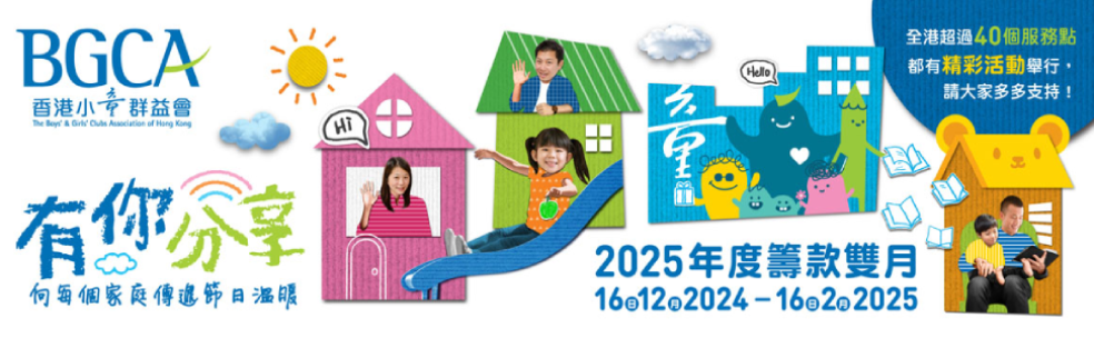 本會的「2025年度籌款雙月」於2024年12月16日至2025年2月16日展開,聯同各服務單位或團隊舉行地區籌款活動,攜手推廣本會及單位服務。籌款活動所籌得的善款將用作支援處於不利環境的兒童及青少年,包括為來自基層家庭、有特別學習成長需要的兒童、青少年及其家庭提供多元化的支援服務,以及物質和非物質資助。