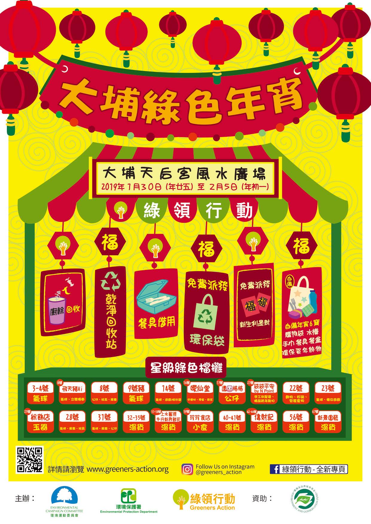 綠領行動與環境運動委員會、環境保護署合作,於2019大埔農曆年宵市場進行環保節慶教育活動:「2019大埔綠色年宵」,鼓勵檔主及遊人惜物減廢,綠樂新年!
