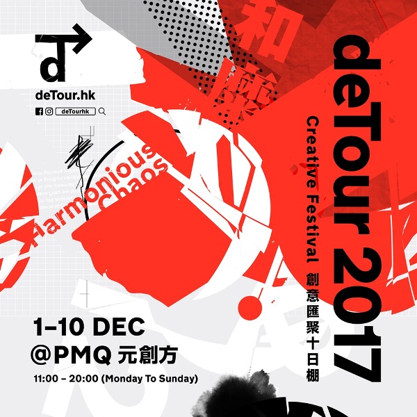 今年deTour 2017聚焦創作過程,混沌中的和諧才最堪玩味。我們將會透過展覽、藝術裝置、工作坊和講座,展示各種由意念到結果設計過程;也會邀請大家投入創作過程,體驗當中的未知與可能。希望你會欣賞設計背後的亂與序,並在體驗創作過程後激活自身的創意。