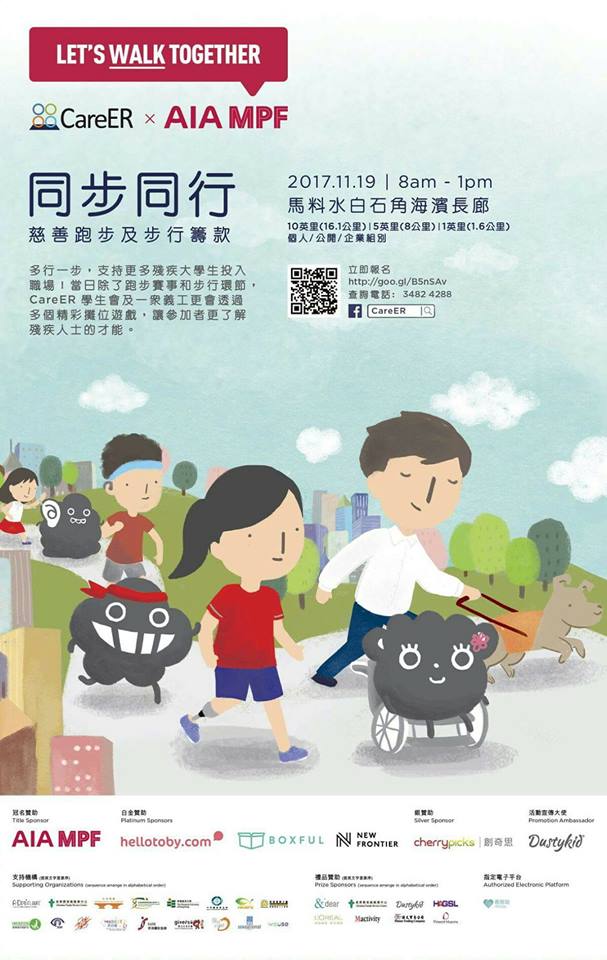 為了可以提供可持續而又免費的求職服務,及持續發展第一個就高學歷殘疾人士成立的學生會及校友會,CareER將會於2017年11月19日(星期日)舉辦名為“同步同行”之年度籌款活動,目的是慶祝聯合國成立的國際殘疾人日,以提高社會對高學歷殘疾人士的關注,同時為CareER的營運籌款。