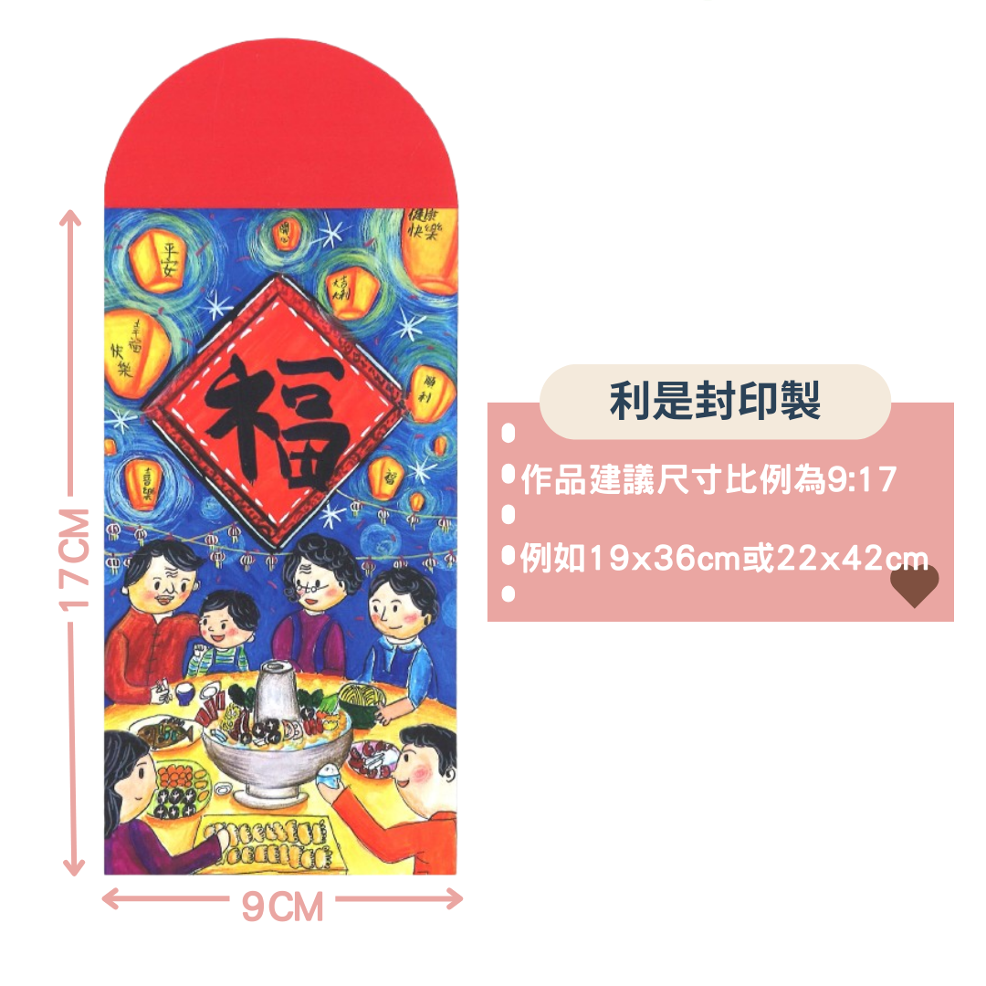 1. 利是封尺寸為9cm(寬)x17cm(長)。 如需使用利是封印製服務,參加者可繪畫於9:17比例之畫紙上, 建議繪畫尺寸為19x36cm 或 22 x42cm。