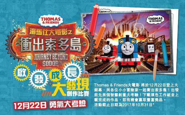 Thomas & Friends大電影將會喺今年聖誕節同大家見面,同各位小冒險家一齊去探險!喺出發前就先同大家做個創意大考驗先!「Thomas啟發成長大發現填色創作比賽」只要你畫得又靚又有創意,就有機會得到非常豐富嘅獎品!獎品包括「Thomas迷霧島大冒險」、「Thomas廢料場逃跑軌道組合」、「迷你Thomas旋轉競賽組合」等!係咪好吸引呢?比賽到10月31日咋!你都快啲參加啦!