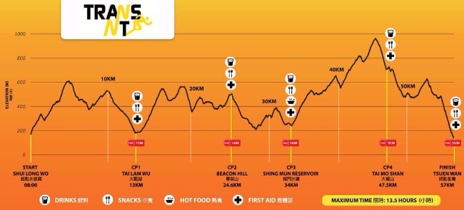TransNT 全長57公里,跨越新界最壯麗的山徑,包括其中兩座香港高山峰 (馬鞍山及大帽山)。全程總爬升幅度3,000米。這是一個非常區挑戰性的越野賽事,參加者必須要有充份的訓練才能於時限13.5小時內完成比賽。